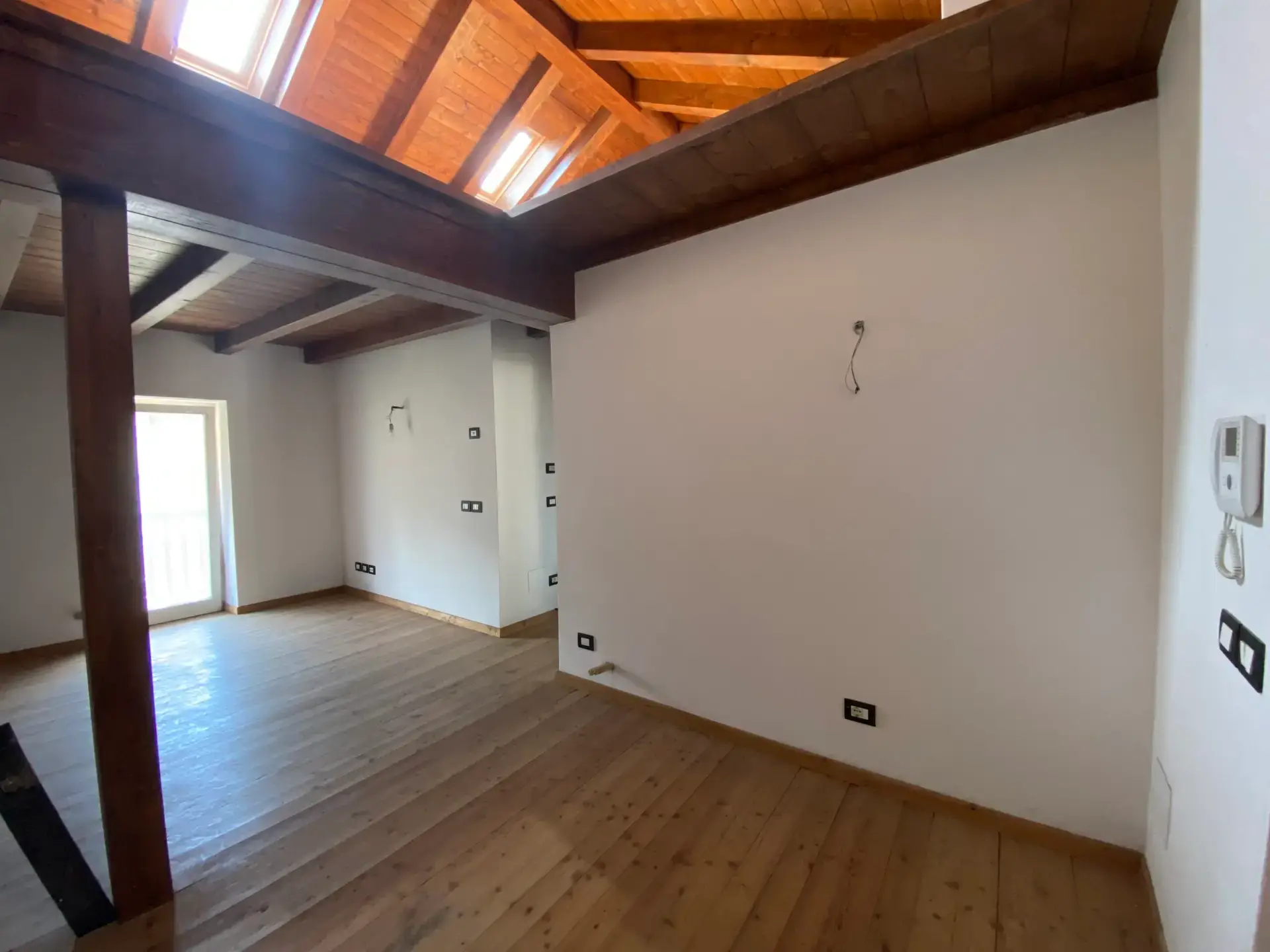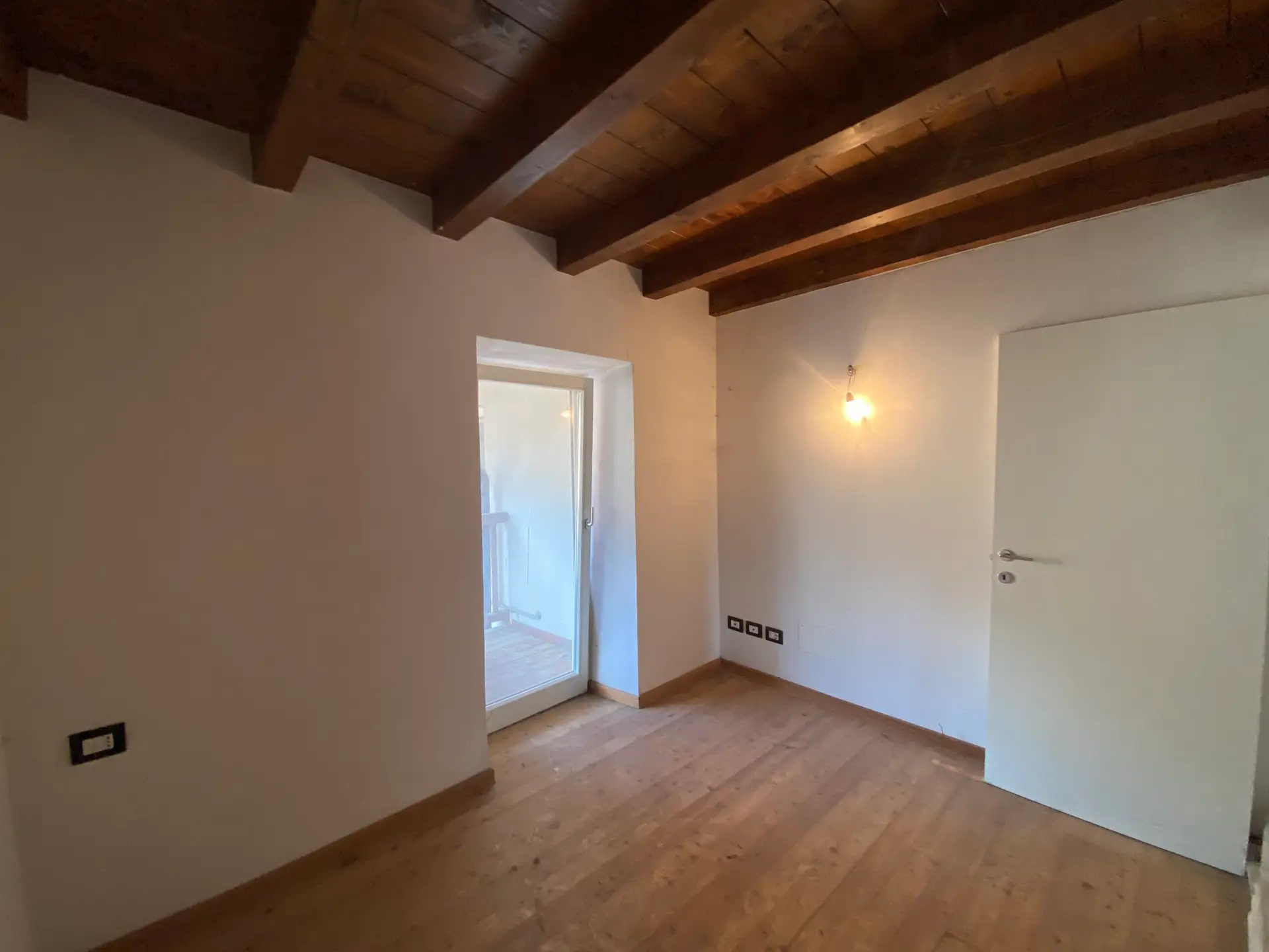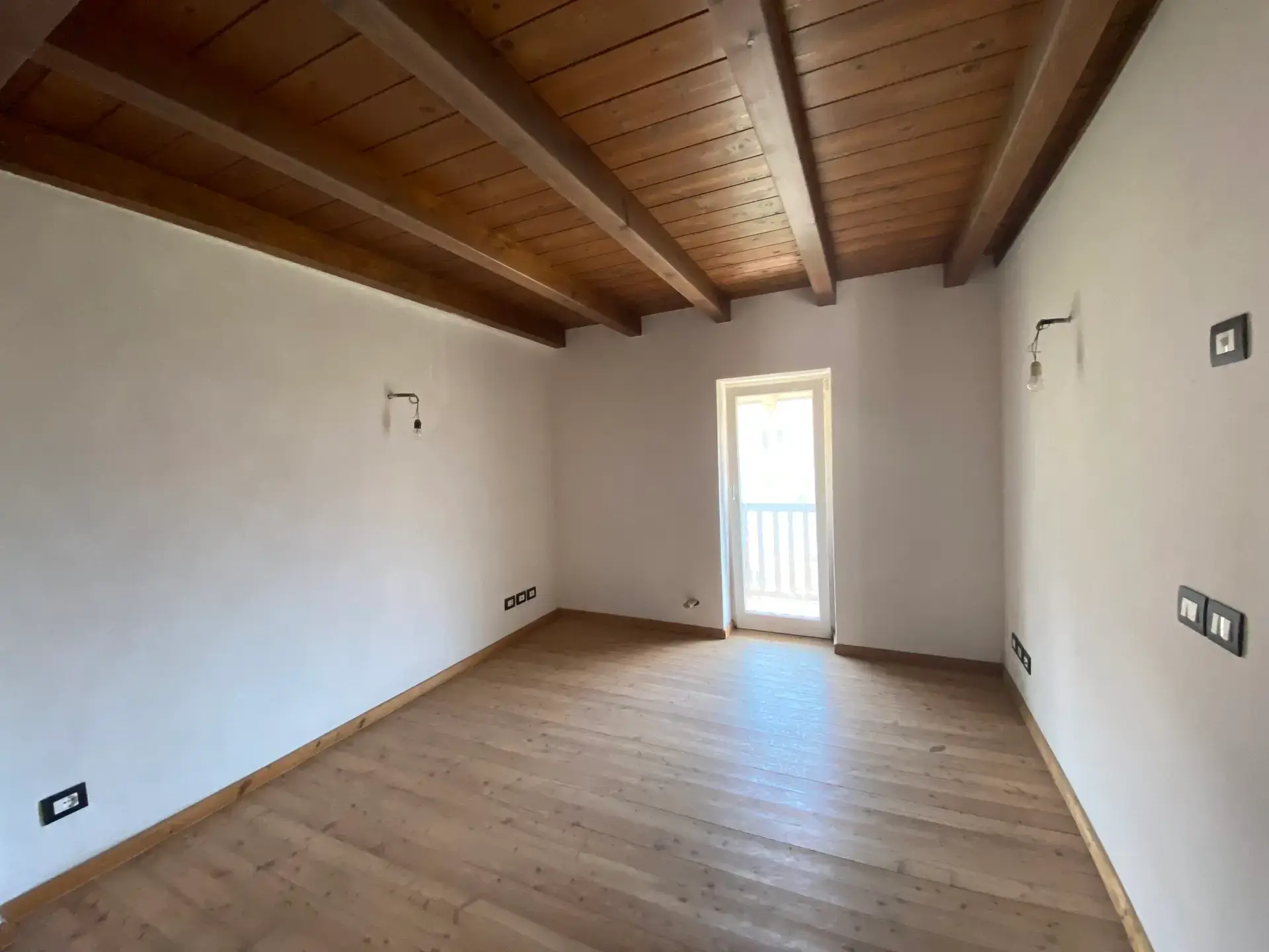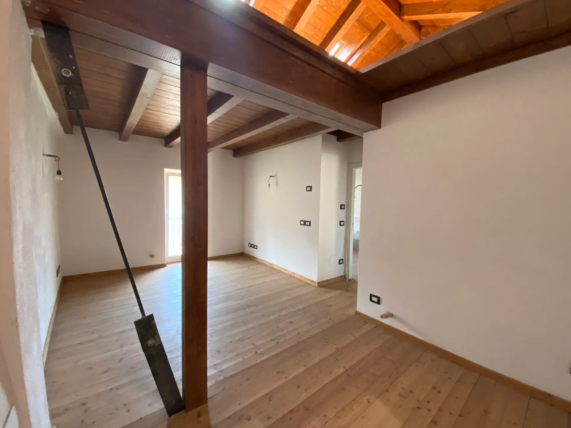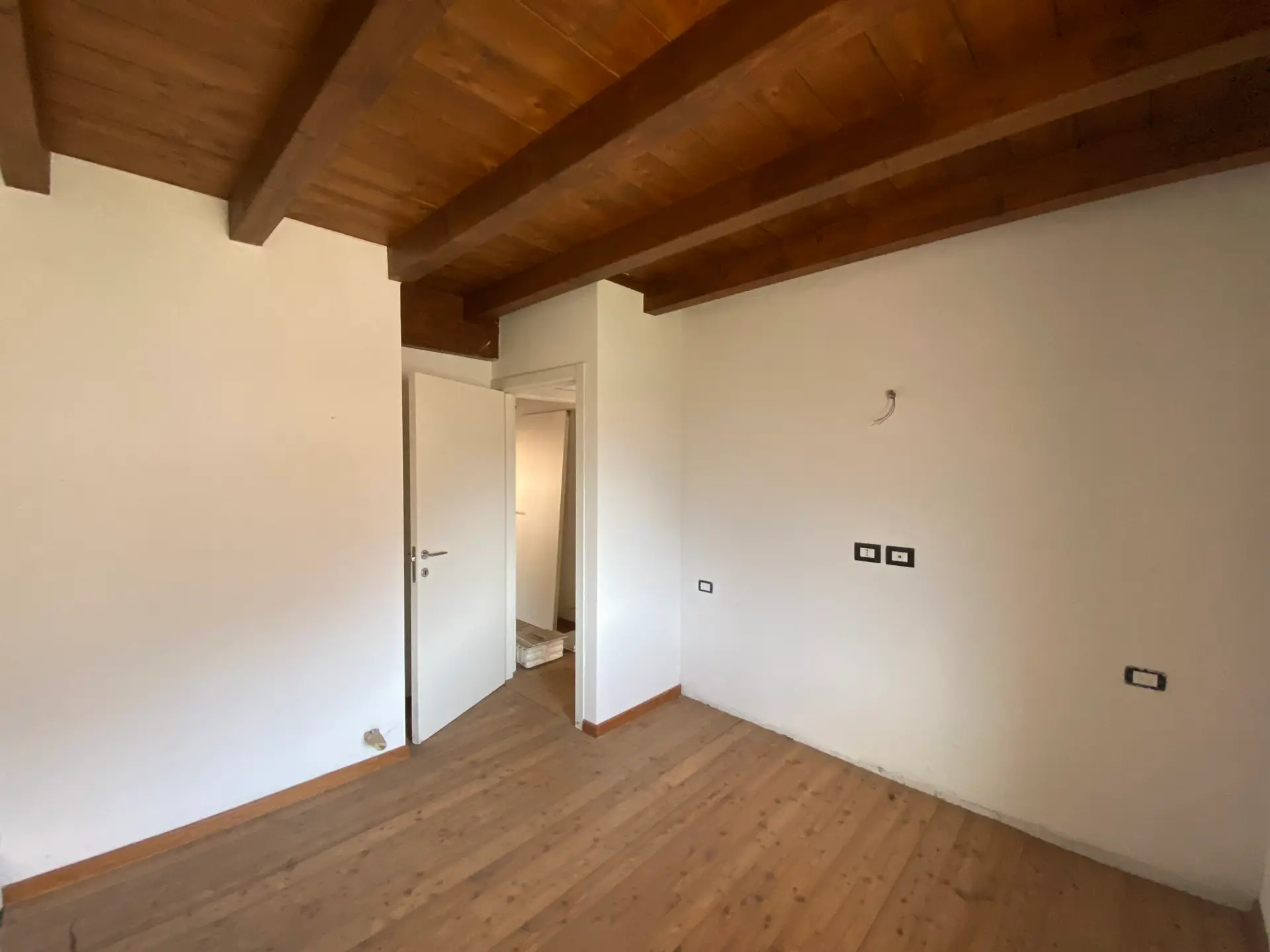 La zona notte è composta da due camere da letto spaziose e ben illuminate, di cui una con uscita su un secondo balcone. L’ambiente, nel complesso, unisce il calore del legno e delle travi a vista alla modernità degli spazi aperti e delle soluzioni architettoniche.