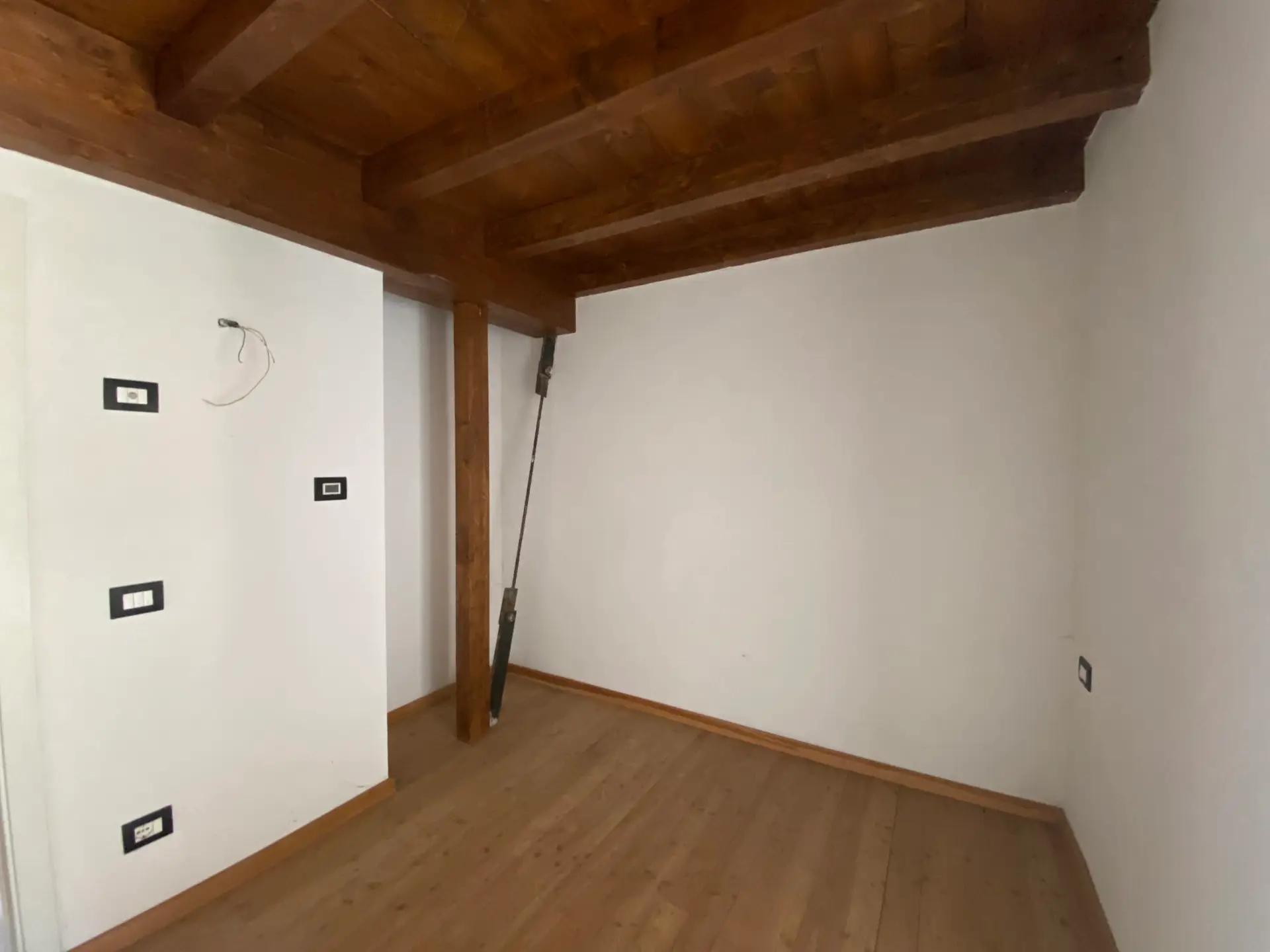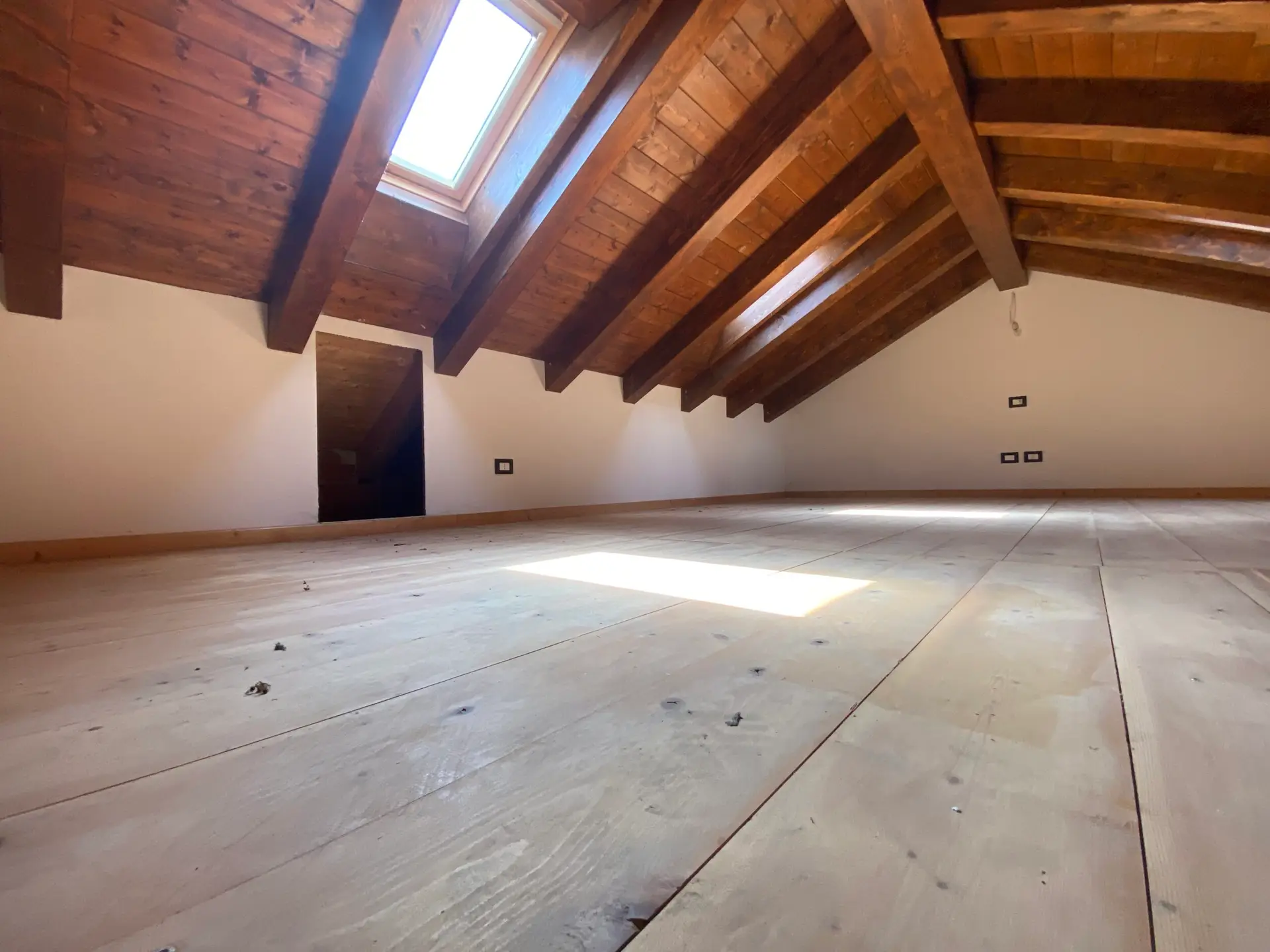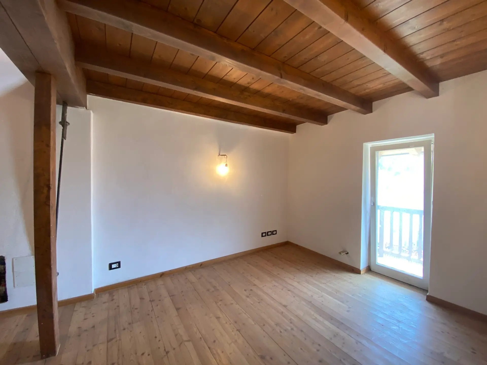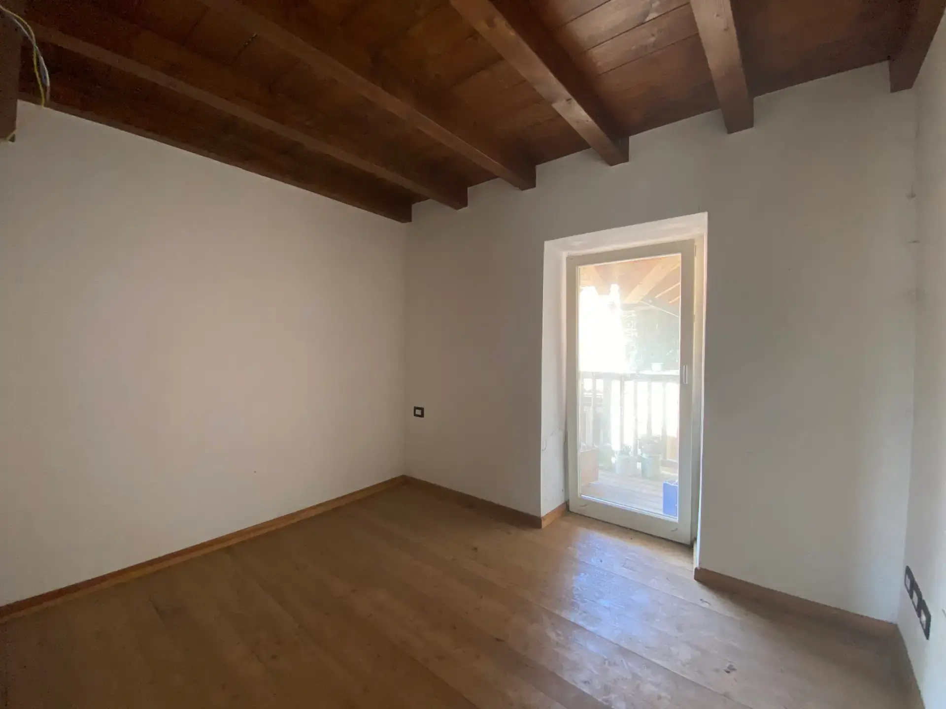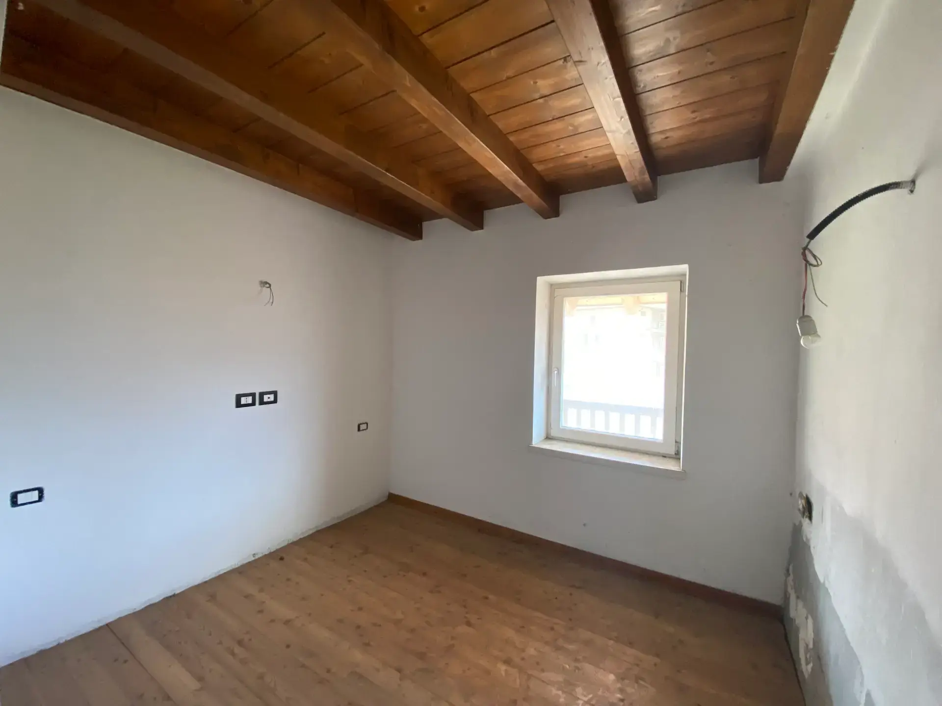 La zona notte è composta da due camere da letto spaziose e ben illuminate, di cui una con uscita su un secondo balcone. L’ambiente, nel complesso, unisce il calore del legno e delle travi a vista alla modernità degli spazi aperti e delle soluzioni architettoniche.