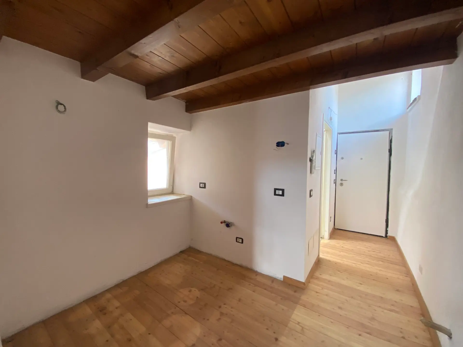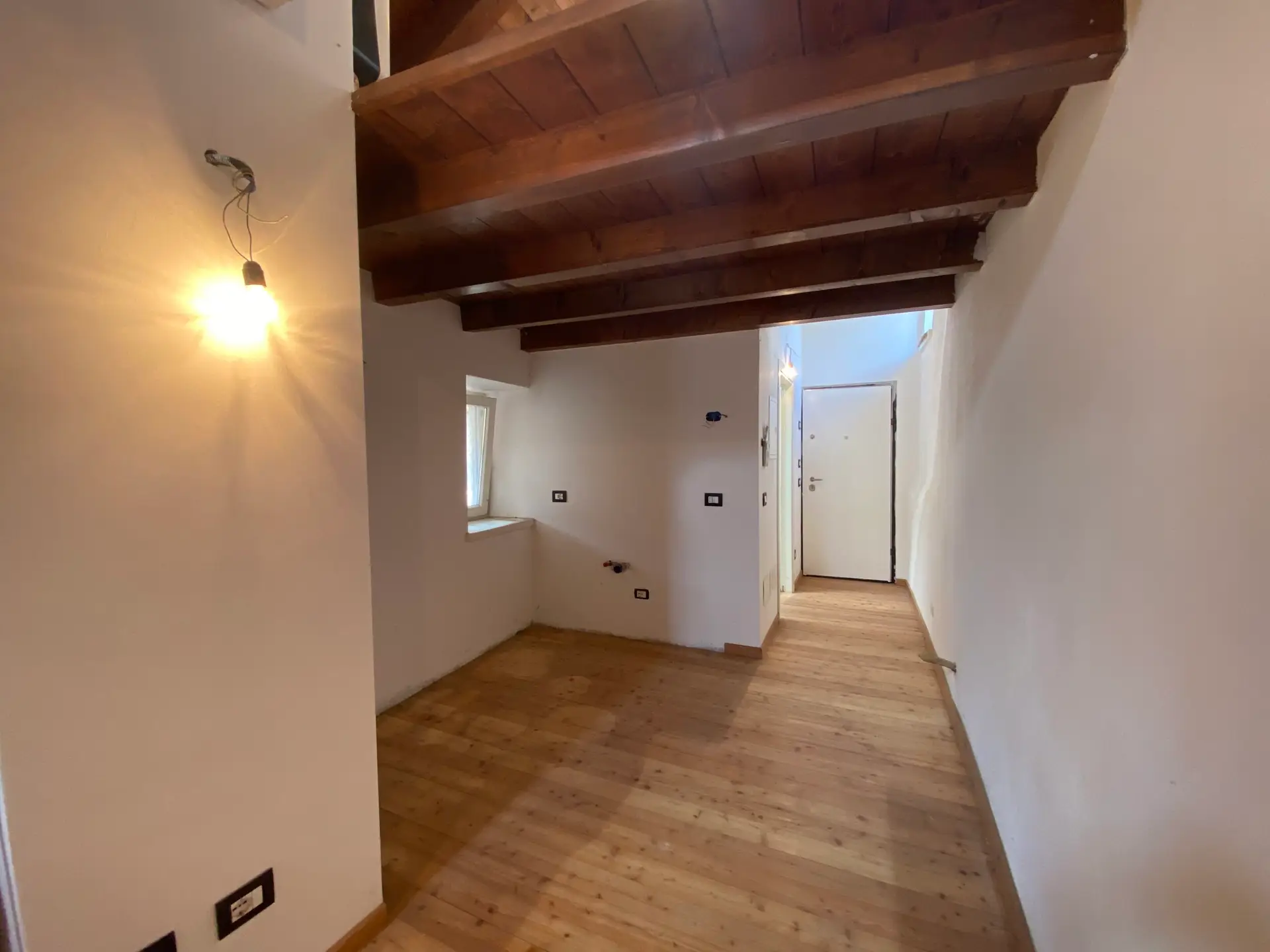 L’ingresso si apre su un comodo disimpegno che conduce immediatamente al bagno, illuminato da un velux, mentre proseguendo si accede all’ampia zona giorno open space, dove la cucina a vista dialoga armoniosamente con l’area living. Da qui si accede al primo dei due balconi, esposto a Sud, che regala luce naturale e una piacevole apertura sull’esterno — un dettaglio raro e prezioso nel contesto del centro storico.
